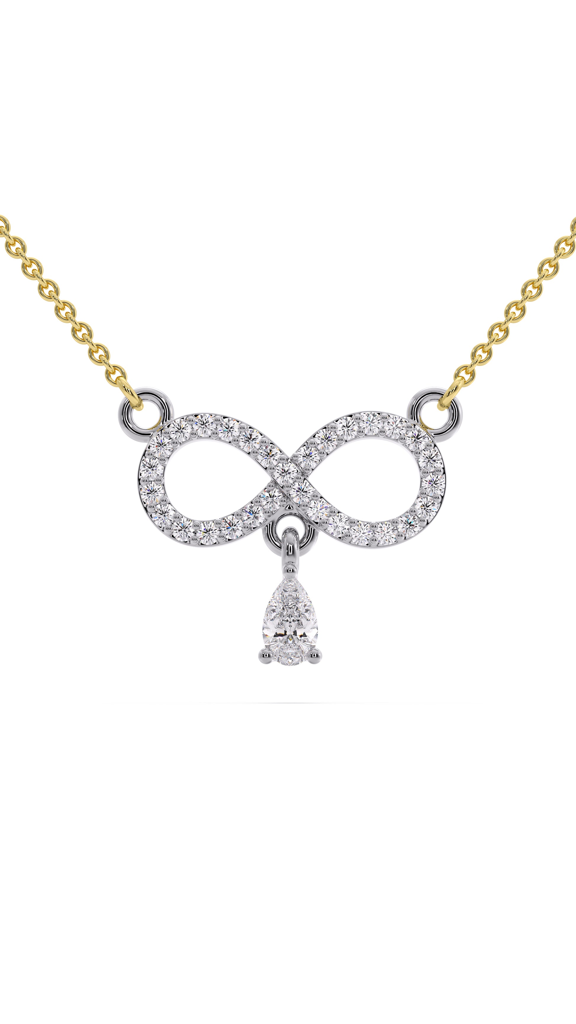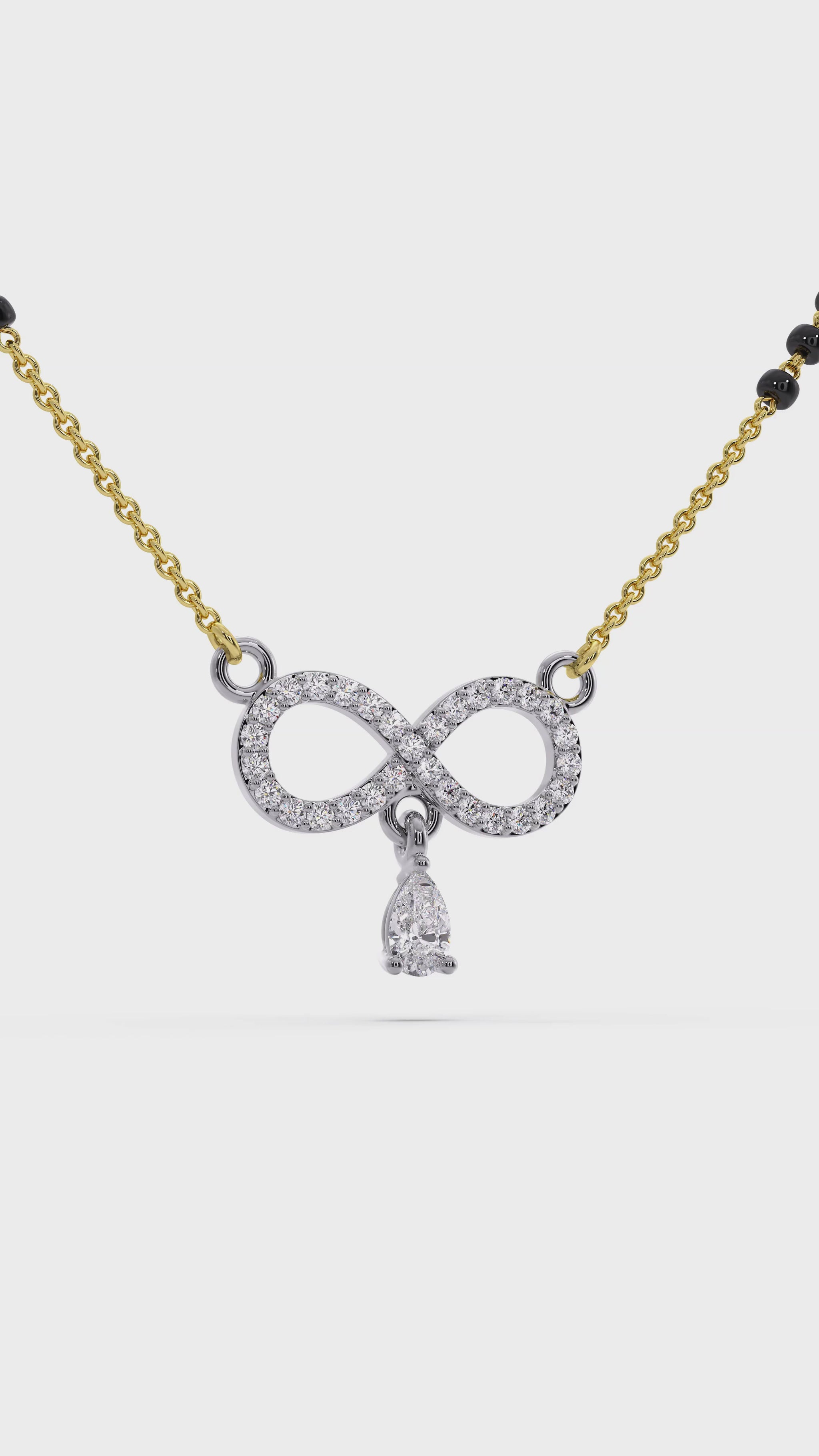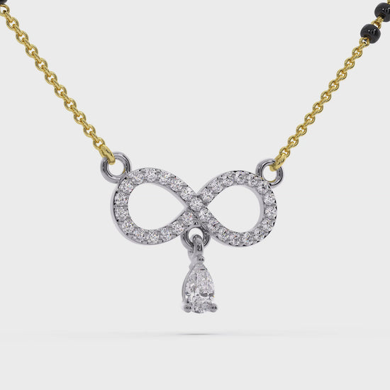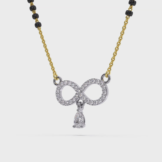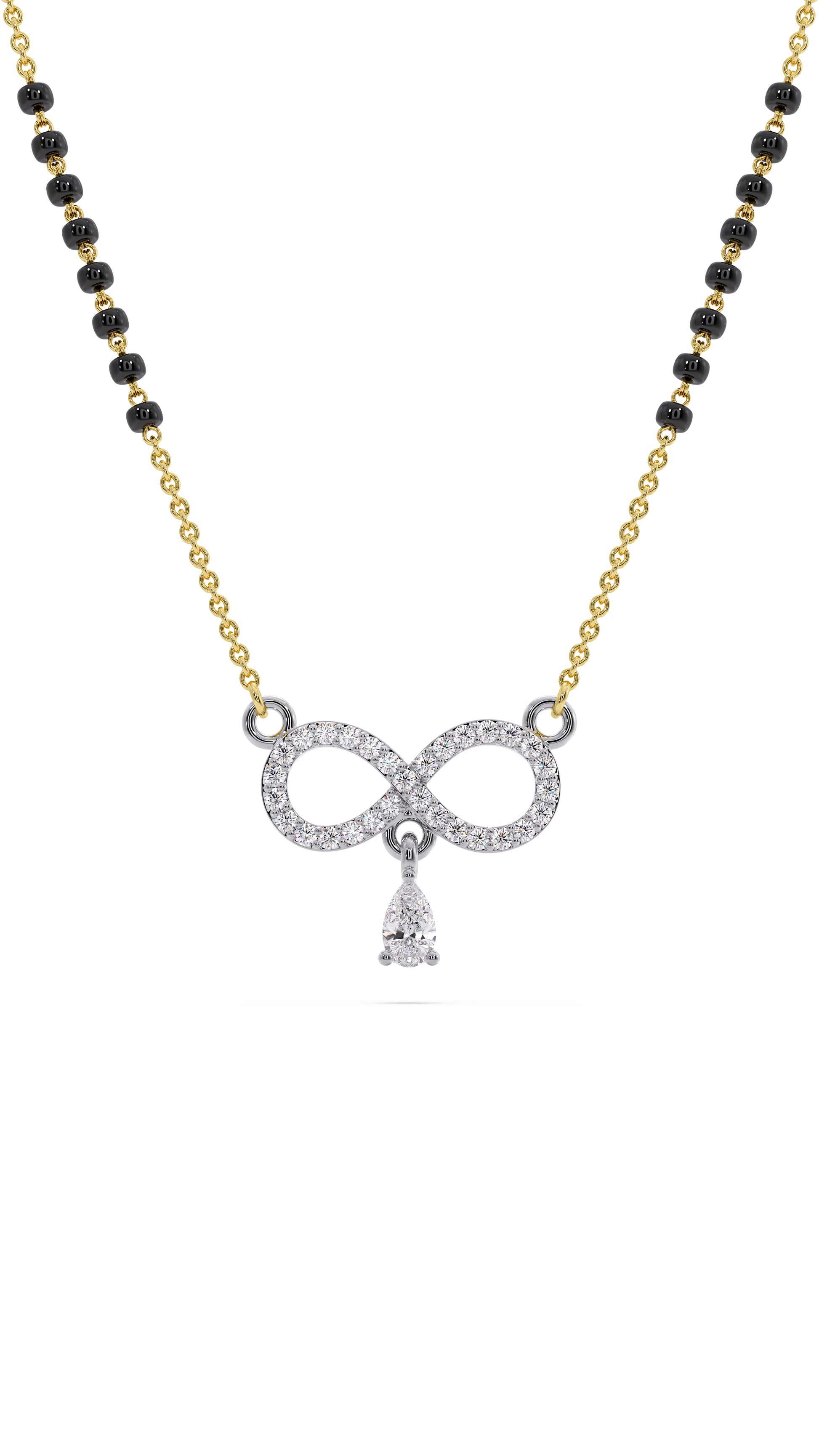 Arvya is made keeping the Infinity link the vocal point. Encrusted with round brilliant cut diamonds, with a small pear cut diamond as a drop. This eye catching mangalsutra is a full on statement piece.