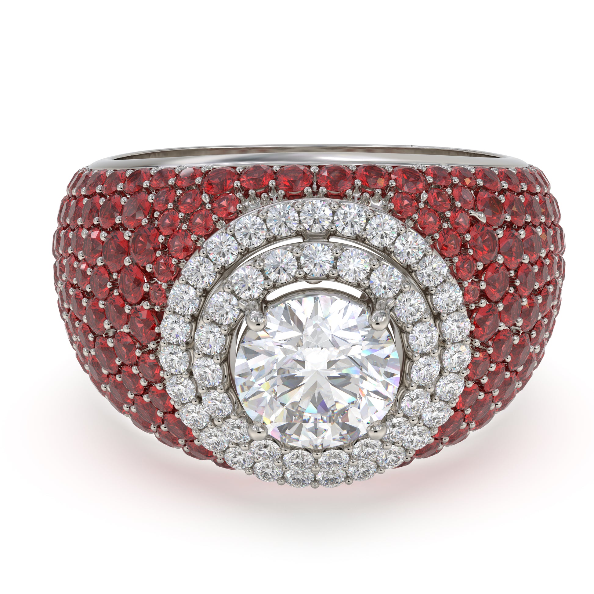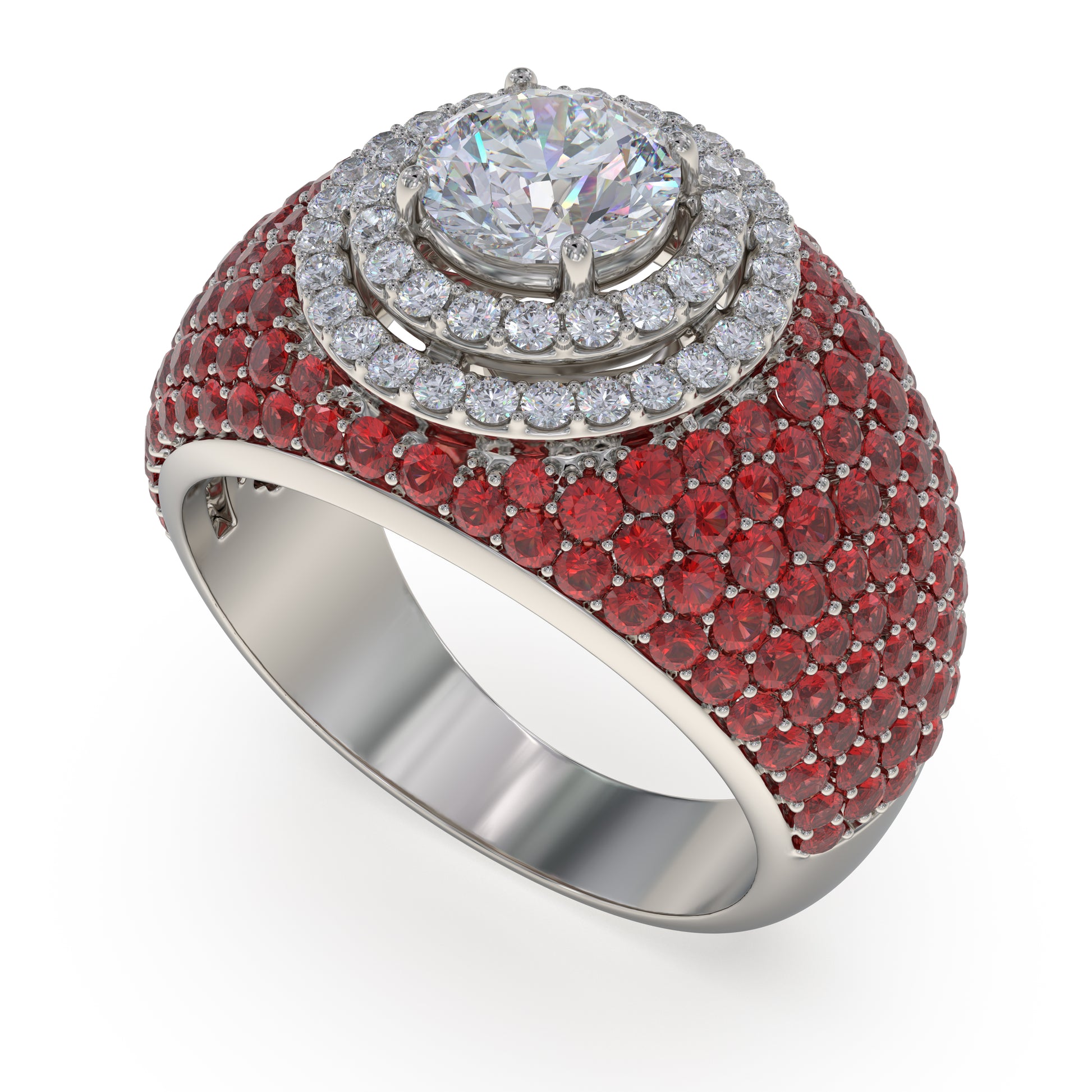 The shimmering grace of Mirani is here to take over in your in your ring collection. This chic design is stunning and dazzling, with deep colour rubies set around a double halo round diamond solitaire. Mirani draws in attention, glamour and passion!