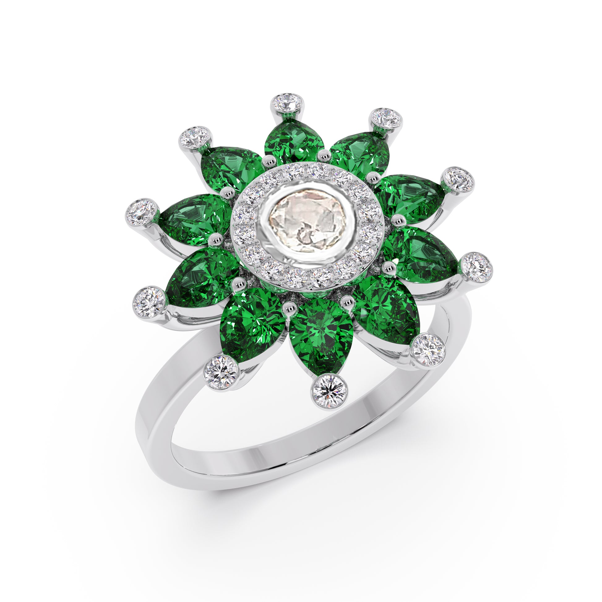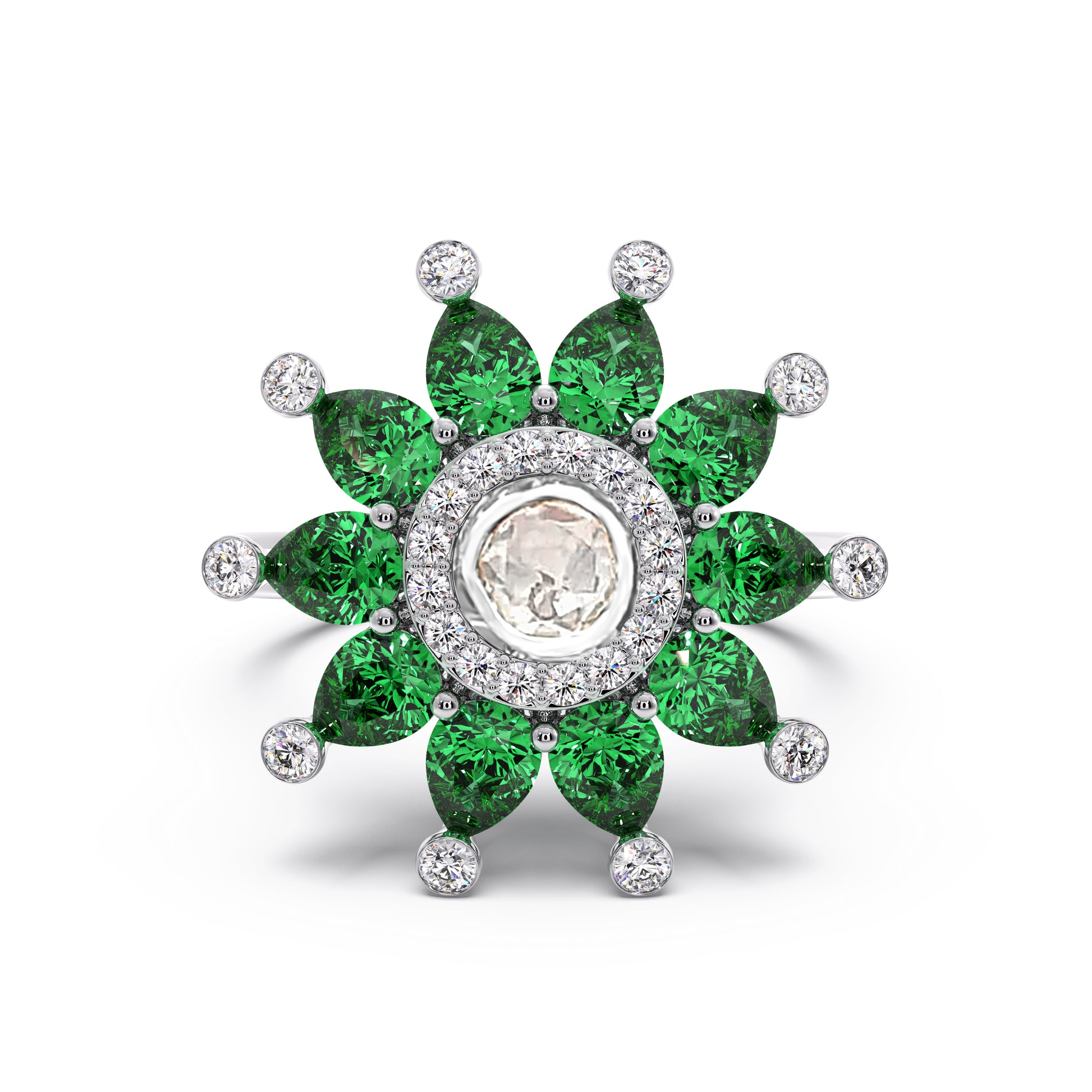 Unleash your bold elegance with the emerald radiance statement ring Stira, where old world glamour meets modern allure. Designed in a striking floral silhouette, this piece features radiant pear cut emeralds fanned around a brilliant round polki uncut diamond centrepiece, all encircled by a halo of shimmering white diamonds. Each emerald is precision set to create a lush, vibrant burst of green, while the surrounding diamonds add unmatched brilliance and dimension. Whether paired with an evening gown or elevating your everyday look, this ring is more than jewellery, its a statement of confidence, grace and unapologetic luxury.