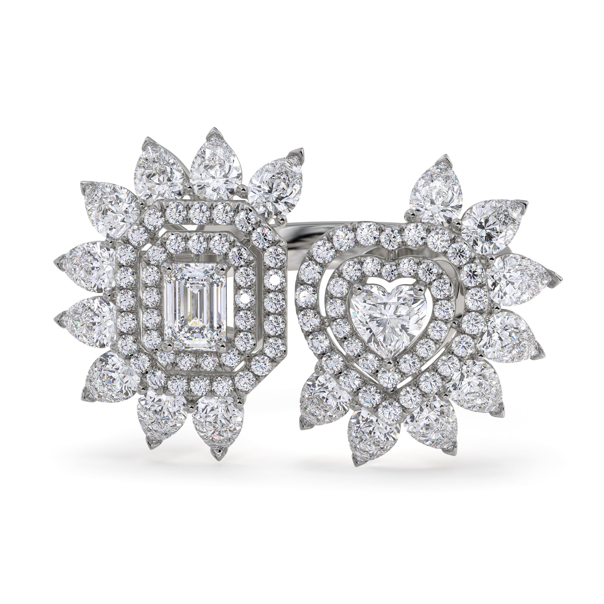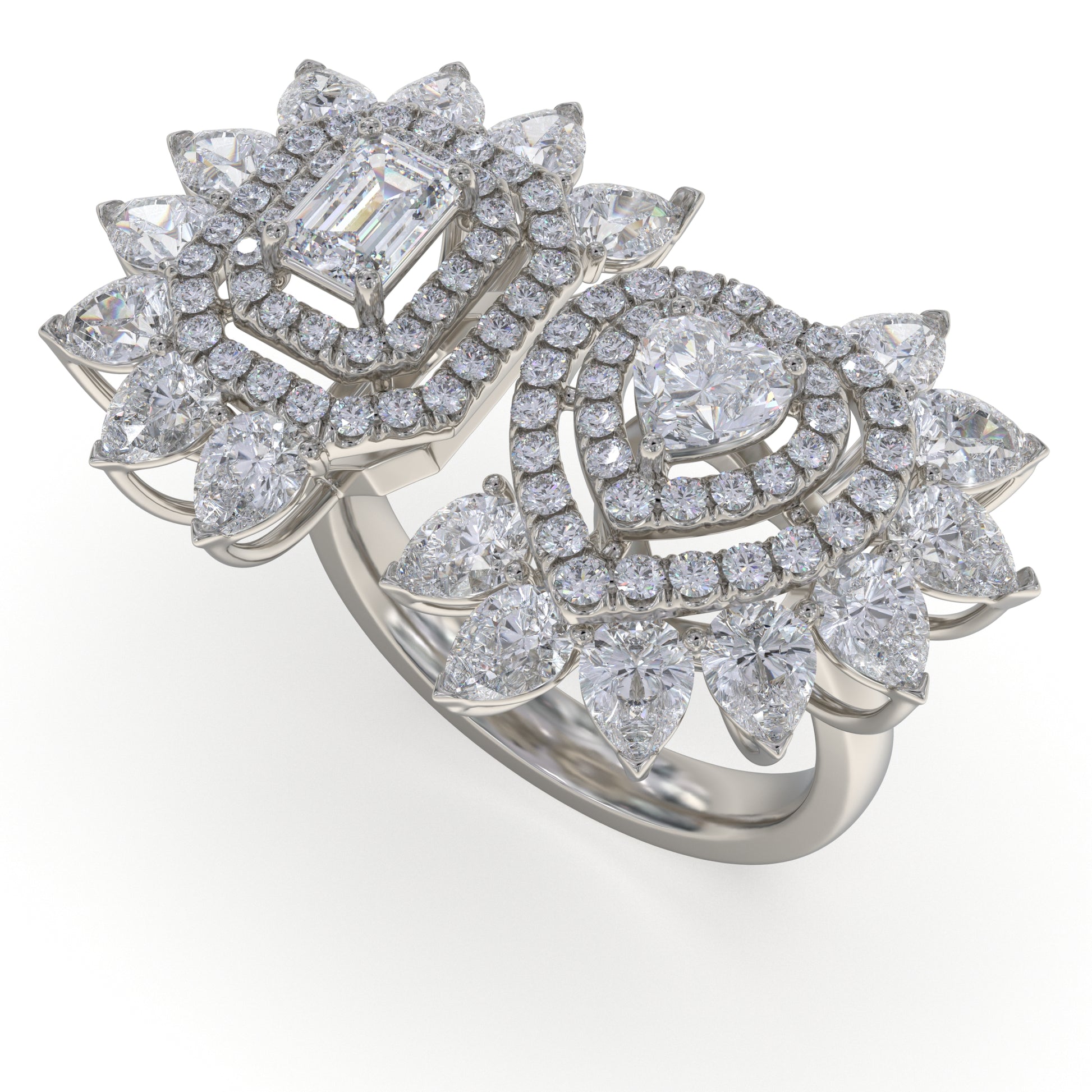 The Syvara ring is a tribute to harmonious strength, for the woman who stands tall in silence and shines without trying. Crafted with a dazzling interplay of brilliant cut diamonds. On one side, an emerald cut centre stone radiates from geometric petal layers while the other showcases a delicate heart shaped diamond at its core. Encircled by rows of pear shaped diamonds. It carry's the meaning of both structure and sentiment that feels bold yet feminine.